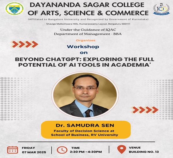 We are excited to announce an upcoming workshop on " Beyond Chat GPT: Exploring the Full Potential of AI Tools in Academia for BBA Faculty", designed to introduce educators to the latest advancements in artificial intelligence and their applications in teaching and research. This interactive session will cover AI-powered tools for content creation, automated assessments, personalized learning, and academic research enhancement.