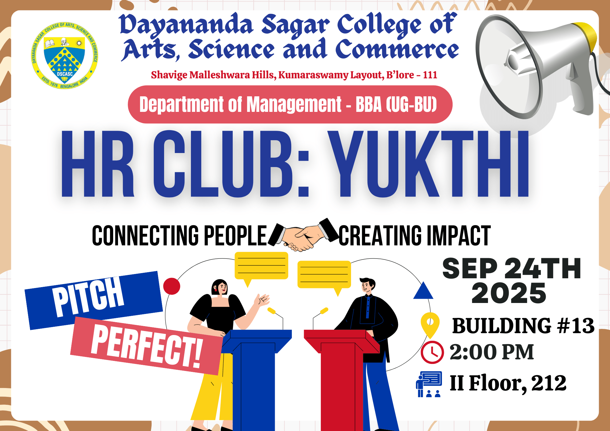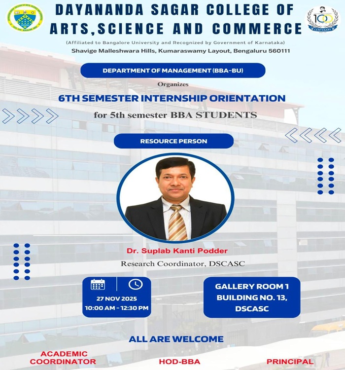 The Department of Management (BBA-BU), Dayananda Sagar College of Arts, Science and Commerce, is organizing a 6th Semester Internship Orientation.