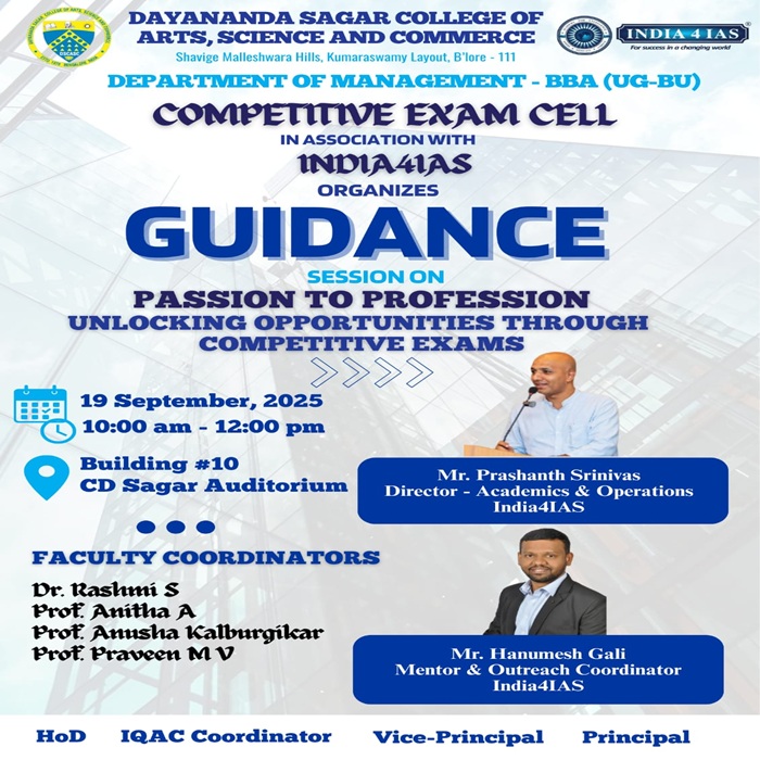 The Department of Management (BBA) and the Competitive Exam Committee are excited to host "Passion to Profession: Unlocking Opportunities Through Competitive Exams," a special guidance session in collaboration with India4IAS. This event is a must-attend for students aiming to build successful careers through competitive exams. Join us on Friday, September 19, 2025, from 10:00 AM to 12:00 PM at the CD Sagar Auditorium to gain invaluable strategies from experts Mr. Prashanth Srinivas and Mr. Hanumesh Gali.