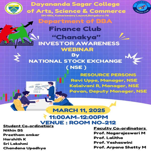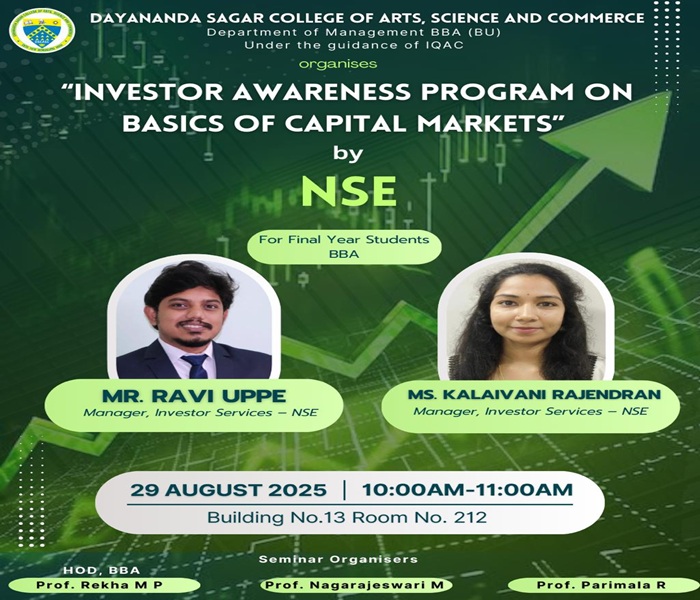 A Guest Talk titled " Investor Awareness Program on Basics of Capital Markets" will be organized for the 5th Semester BBA Students by the BBA Department on 29th August 2025 at 10 am in Room No. 212, Building no 13, DSCASC. Mr. Ravi Uppe and Ms. Kalaivani Rajendran, Managers, Investor Services- NSE will share their expertise.