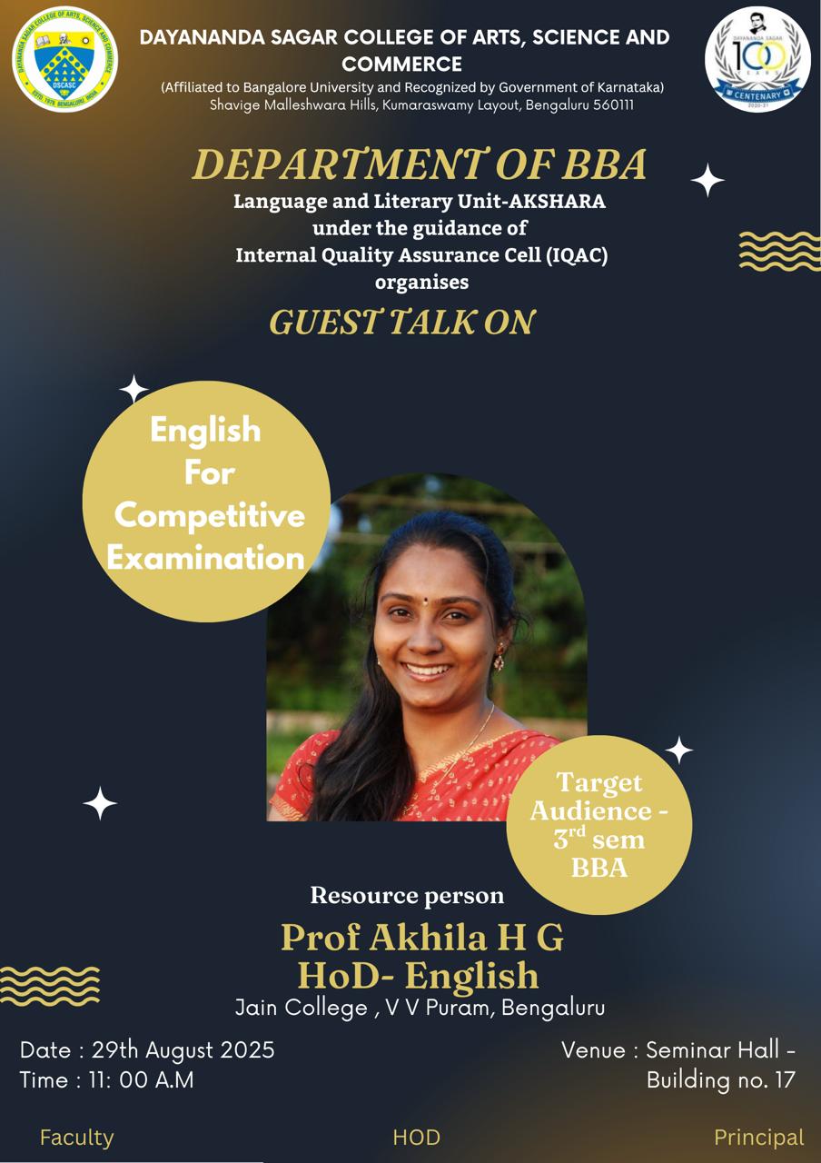 A Guest Talk titled "ENGLISH FOR COMPETITIVE EXAMINATION" will be organized for the 3rd Semester BBA students by the BBA Department on 29th August 2025 at 11:00 am in the Seminar Hall, Building no. 17, DSI. Prof. Akhila H. G., HoD-English, Jain College, V V Puram, Bengaluru will share her expertise